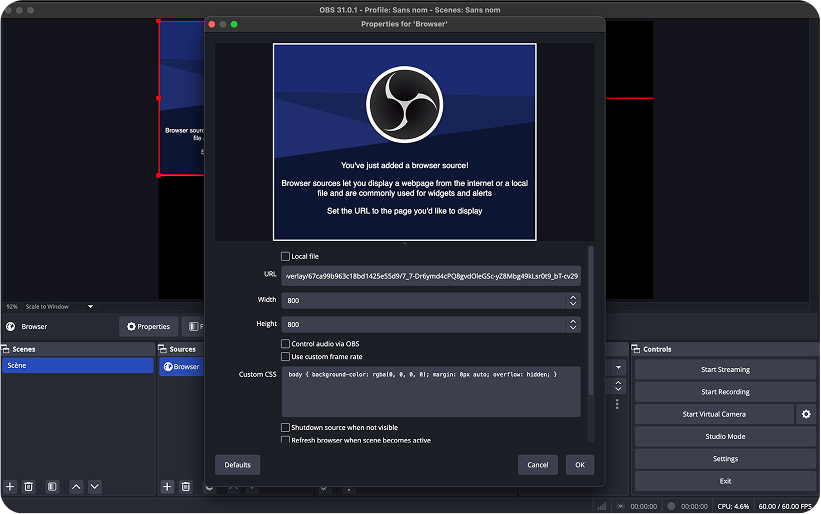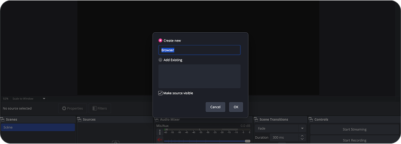 1/ Open OBS or Streamlabs on your computer and add a new source: “Browser ”.